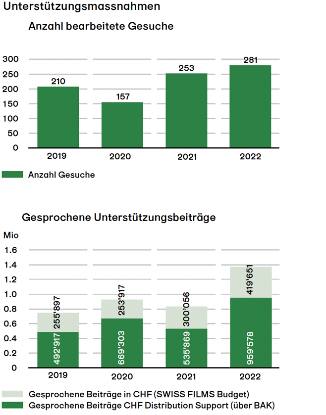 Als Rekordjahr erwies sich das Jahr 2022 bei den Unterstützungsmassnahmen, deren Mittel direkt der Schweizer Filmbranche zugutekommen. Noch nie zuvor erhielt SWISS FILMS so viele Anträge für den Festival Support. Auch bei der Exportförderung war ein starker Anstieg der Auszahlungen zu verzeichnen. Ein Überblick zu den Gesuchen und Unterstützungsbeiträgen gibt die Seite 16.