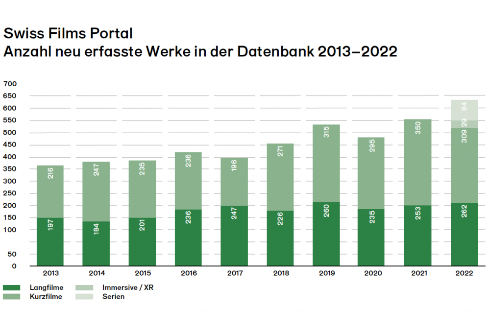 Im Swiss Films Portal – der Datenbank von SWISS FILMS – wurden letztes Jahr mit 684 Projekten mehr Werke neu erfasst als je zuvor. Zum ersten Mal wurden 2022 auch Schweizer Serien der letzten Jahre erfasst und auf der Website publiziert. Diese verzeichnete im ersten Jahr nach dem Relaunch einen starken Zuwachs. Mehr zur Verdoppelung der Reichweite im Web (S. 22)